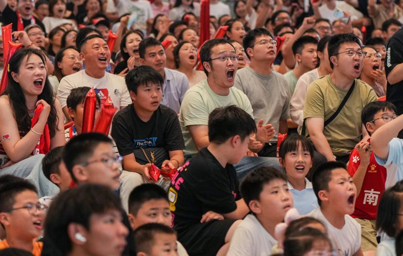 6月29日,市民、球迷在南通市內(nèi)一處商場(chǎng)觀看比賽直播,為球隊(duì)加油吶喊。