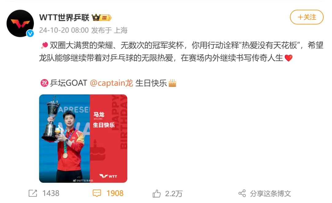 馬龍36歲生日當天,WTT世界乒聯發文為其慶生:“雙圈大滿貫的榮耀、無數次的冠軍獎杯,你用行動詮釋‘熱愛沒有天花板’,希望龍隊能夠繼續帶著對乒乓球的無限熱愛,在賽場內外繼續書寫傳奇人生。”