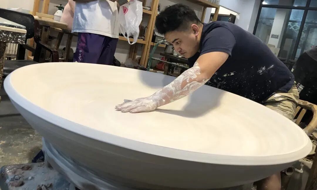 “三四天睡一次,白天做事,晚上拉坯。”剛上手拉坯機時,韓向東恨不得天天練。冬天冷風穿過碎掉的玻璃窗,他睡在金水廠的水泥臺子上渾身打顫;夏天做工易出汗打滑,他養成了光腳干活的習慣,持續至今。做學徒沒工資,他只能吃食堂的剩飯剩菜,“沒有油水餓得快,就狂吃大米飯。”4年之后,韓向東體重從110斤飆到150斤,典型的過勞肥。