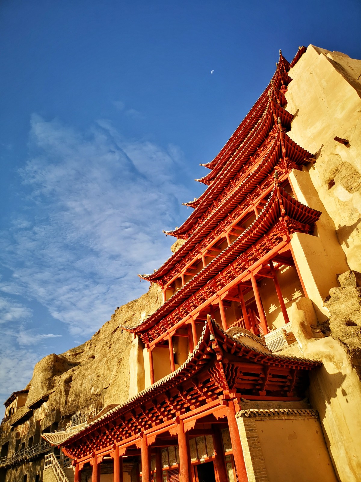 莫高窟位于甘肅敦煌,處河西走廊的西部盡頭,它的開鑿從十六國時期至元代,前后延續約1000年,現有洞窟735個,保存壁畫4.5萬多平方米,彩塑2400余尊,唐宋木構窟檐5座,是一處由建筑、繪畫、雕塑組成的博大精深的綜合藝術殿堂,是世界上現存規模最宏大、保存最完好的佛教藝術遺址。