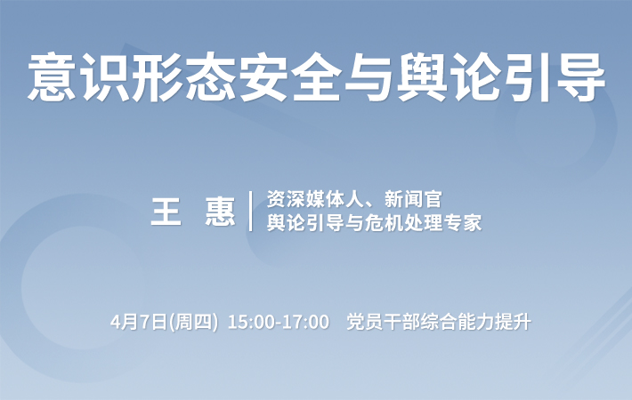 4月7日(周四)15:00-17:00,“人民學習·黨員干部綜合能力提升”直播課程,將由資深媒體人、新聞官,輿論引導與危機處理專家王惠講授《意識形態安全與輿論引導》。