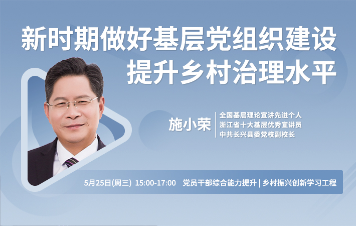 5月25日(周三)15:00-17:00,“人民學(xué)習(xí)·黨員干部綜合能力提升”直播課程,將由全國(guó)基層理論宣講先進(jìn)個(gè)人,浙江省十大基層優(yōu)秀宣講員,中共長(zhǎng)興縣委黨校副校長(zhǎng)施小榮講授《新時(shí)期做好基層黨組織建設(shè),提升鄉(xiāng)村治理水平》。