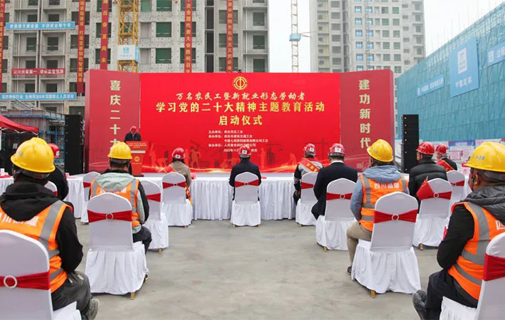 11月9日下午,陜西省西安市總工會“萬名農民工暨新就業形態勞動者學習黨的二十大精神主題教育活動”啟動儀式在中建七局第四建筑有限公司團結村項目工地舉行,現場有50名農民工及新就業形態勞動者代表參加,并設五個分會場,近千名農民工暨新就業形態勞動者共同學習。儀式由西安市總工會常務副主席王雷主持,西安市人大常委會副主任、市總工會主席薛振虎帶領市總工會班子成員出席,并邀請黨的二十代表惠敏莉及部分農民工勞模代表共同參會。