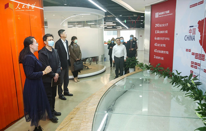 楊志福副書記、李新亮委員一行首先參觀了人民學(xué)習(xí)智慧教室全國(guó)分布圖、演播大廳、直播總控室,詳細(xì)了解了“人民學(xué)習(xí)”的品牌布局以及關(guān)于社區(qū)干部隊(duì)伍建設(shè)的創(chuàng)新發(fā)展理念等情況。