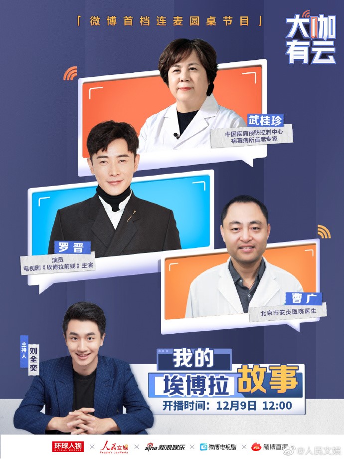 重大現實主義題材電視劇《埃博拉前線》近日開播,中國援非醫療隊抗擊埃博拉病毒的英雄事跡、中非友誼的動人時刻再現熒屏。12月9日,微博首檔圓桌連麥節目《大咖有云》聯合人民文娛、微博電視劇聯合推出特別專題——《我的埃博拉故事》。