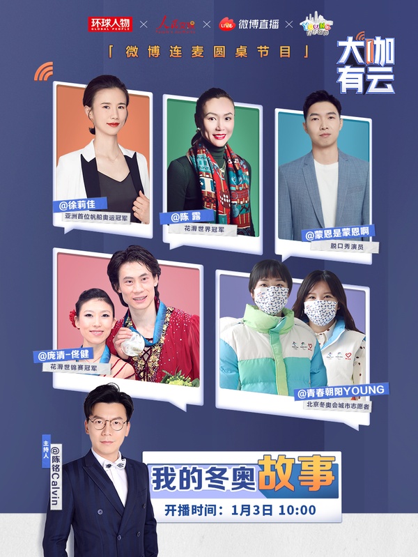 1月3日,微博連麥圓桌節(jié)目《大咖有云》推出冬奧特別節(jié)目。第一期邀請(qǐng)花樣滑冰世界冠軍陳露、花滑世界冠軍佟健、帆船奧運(yùn)冠軍徐莉佳、脫口秀演員楊蒙恩以及冬奧城市志愿者齊聚云端,與主持人陳銘共同暢談難忘冬奧故事,分享雙奧之城志愿者服務(wù)站啟動(dòng)盛況。