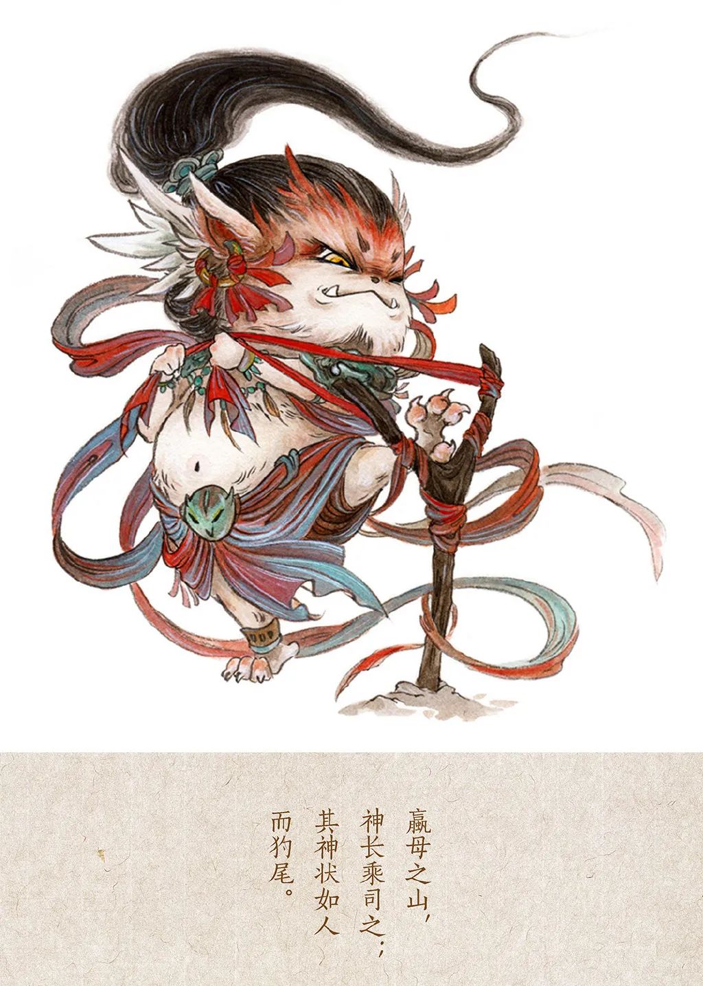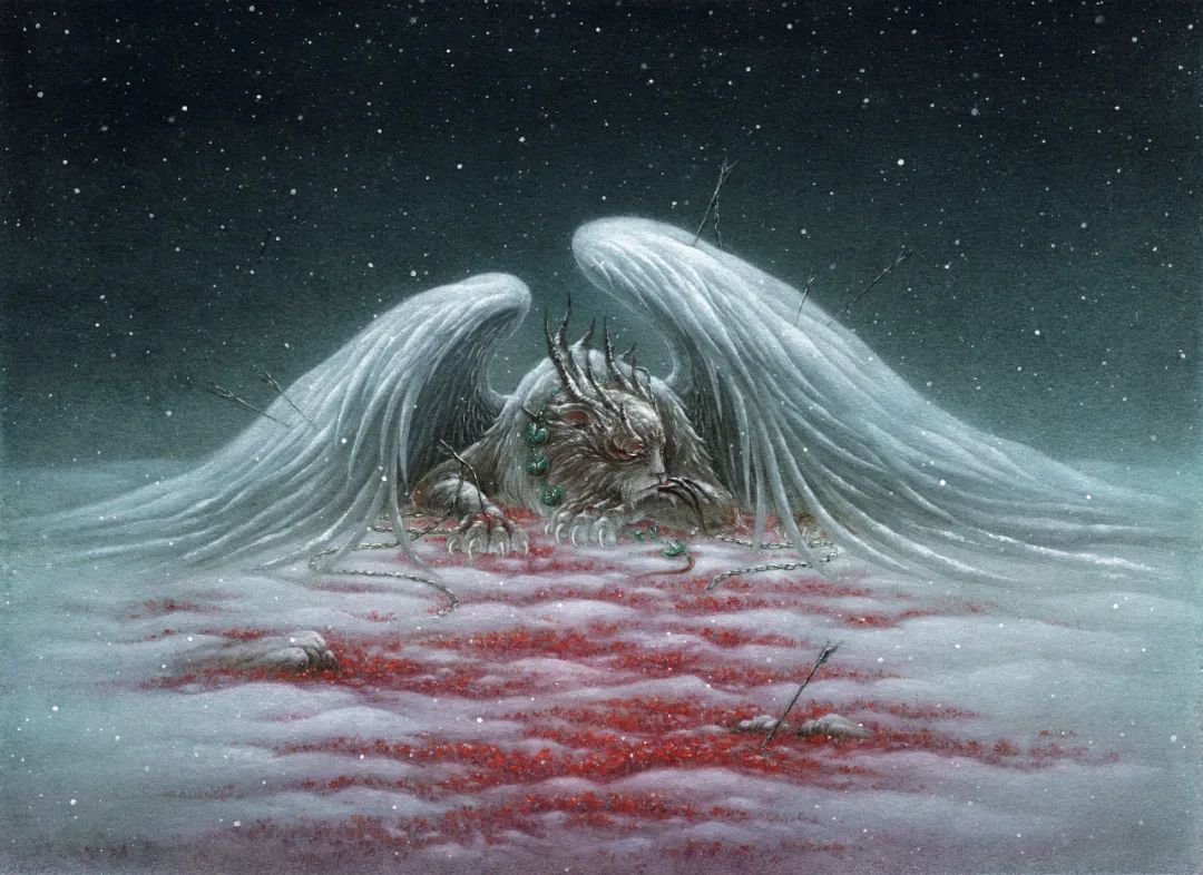 譬如窮奇,古籍中對其外貌的描寫不盡相同,但無一例外都將它劃歸為窮兇極惡的兇獸。在如今的影視作品中,窮奇也都是邪惡的反派角色。在畫窮奇時,杉澤想提供一個不一樣的視角——它為什么會成為現在這樣。于是,他在窮奇的臂彎上畫了一只小燕子,它們身負重傷,倒在雪地里,血染紅了一片雪地,開出朵朵紅花。在他的構想里,窮奇為了保護小燕子被箭射傷、被鎖鏈禁錮,但最終還是失去了這唯一的朋友,它變得不再相信人,也不再相信正義。“可能故事有點老套,但我想給大家提供一個視角,原本在我們印象里非常兇惡的形象,或許也有溫情柔和的一面。”杉澤說。
