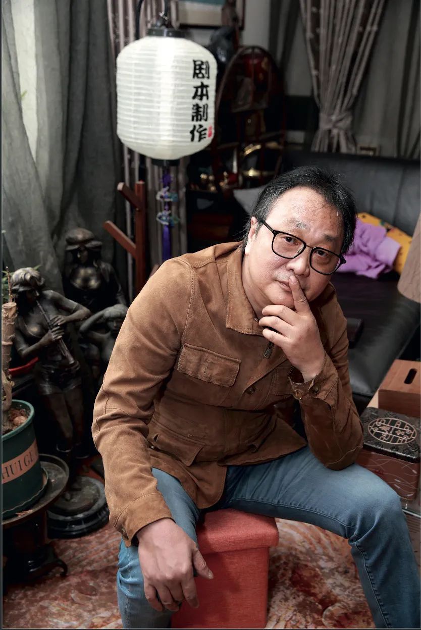 天陰沉沉的,他的家里有些暗,客廳很大,但被各種小玩意塞滿。大多是雕塑,木雕、銅雕、石雕,有人像也有動物,大大小小,散落在地上、書架上、茶幾上、窗臺上。有一個“西方女神”斜立在一堆雜物中,衣袂飄飄。窗邊是一張大書桌,角落里立著一臺落地?zé)簦瑹纛^像一盞燈籠,上面寫著四個字:劇本制作。