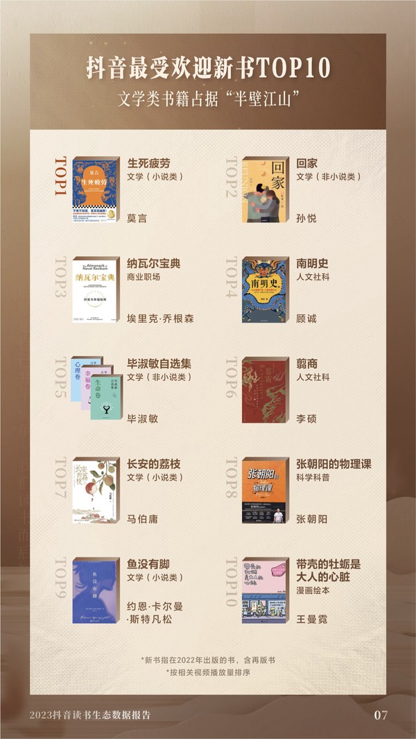 在抖音最受歡迎十大當代作家中,金庸、路遙、余華分列前三位,莫言、史鐵生等在列。此外,聚合了100位科學家導讀100本科學經典書籍的讀書公開課《高山科學經典》,以超7800萬次播放量成為抖音最受歡迎的讀書公開課。