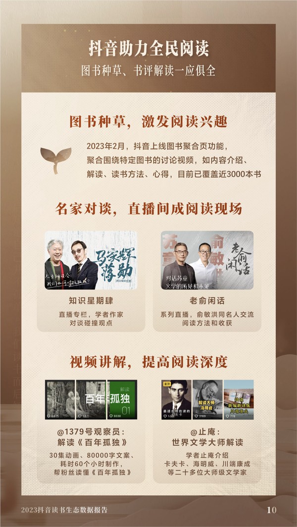 優質的創作者是抖音讀書生態中的重要一環。截至2023年2月,共有10位茅盾文學獎獲獎作家入駐抖音,超1500位圖書作者在抖音分享讀書心得。莫言、劉震云等知名作家,北大、清華等高校,以及康震、蔡丹君等高校學者紛紛入駐抖音,通過短視頻和直播等方式助力國民閱讀經典。
