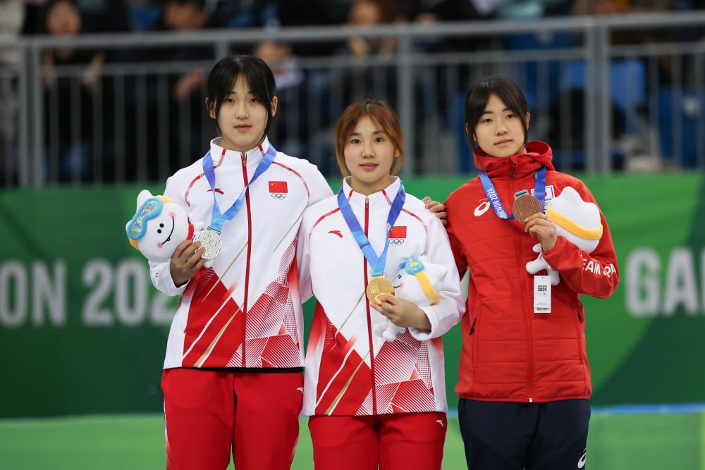 1月20日,冠軍中國選手楊婧茹(中)、亞軍中國選手李金恣(左)與季軍日本選手井上暖乃美在頒獎儀式上合影。新華社記者 許雅楠 攝