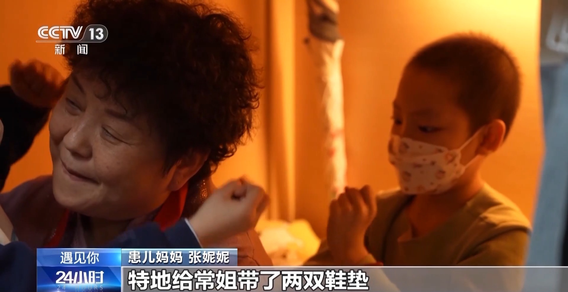 患兒媽媽 張妮妮:陸陸續續在這兒住了快一年多了。我娃一給他外婆打電話就說,我去了在心羽家園住著,還有常媽媽。我媽就說這次來了,特地給常姐帶了兩雙鞋墊。每一次都回來看看常姐,這兒就像一個大家庭,比家還溫暖。