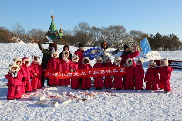 阿什河畔,以冰代紙、以刀為筆,張偉洪帶著15名來自天津的小朋友進行“拓彩冰雪畫”研學創作,濺起冰花片片。