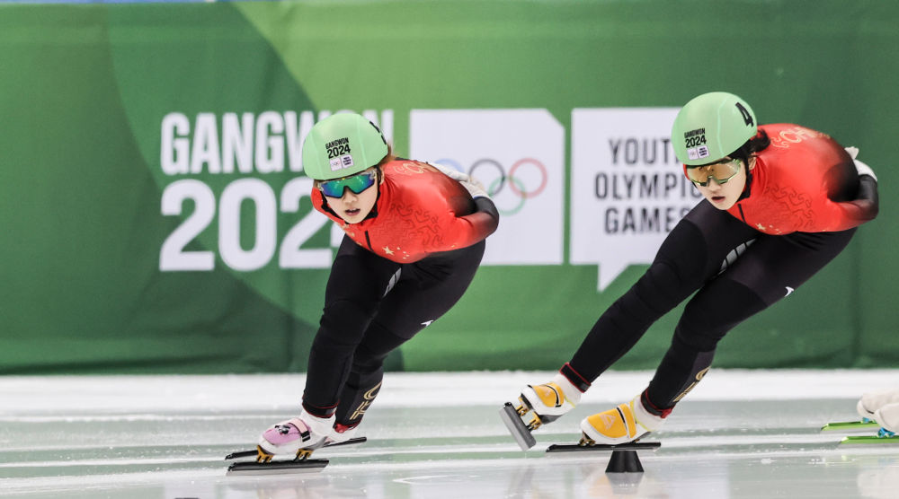 1月20日,中國選手楊婧茹與李金恣(右)在短道速滑女子1500米決賽中。新華社記者 許雅楠 攝