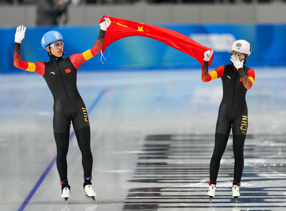 1月25日,潘寶碩(左)/劉昀琪在速度滑冰混合接力決賽后慶祝奪冠。新華社記者 張笑宇 攝