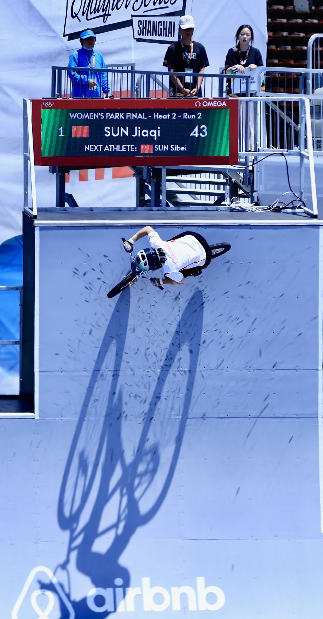 5月18日上午,在奧運會資格系列賽·上海的女子自由式小輪車決賽中,中國紅席卷賽場。三位出戰的中國女將憑借第一輪的出色發揮包攬決賽前三。孫思蓓在第2輪壓軸出場以全場最高的95.86分奪冠,孫佳琪和鄧雅文分別以93.68分、91.50分,位居二三位。