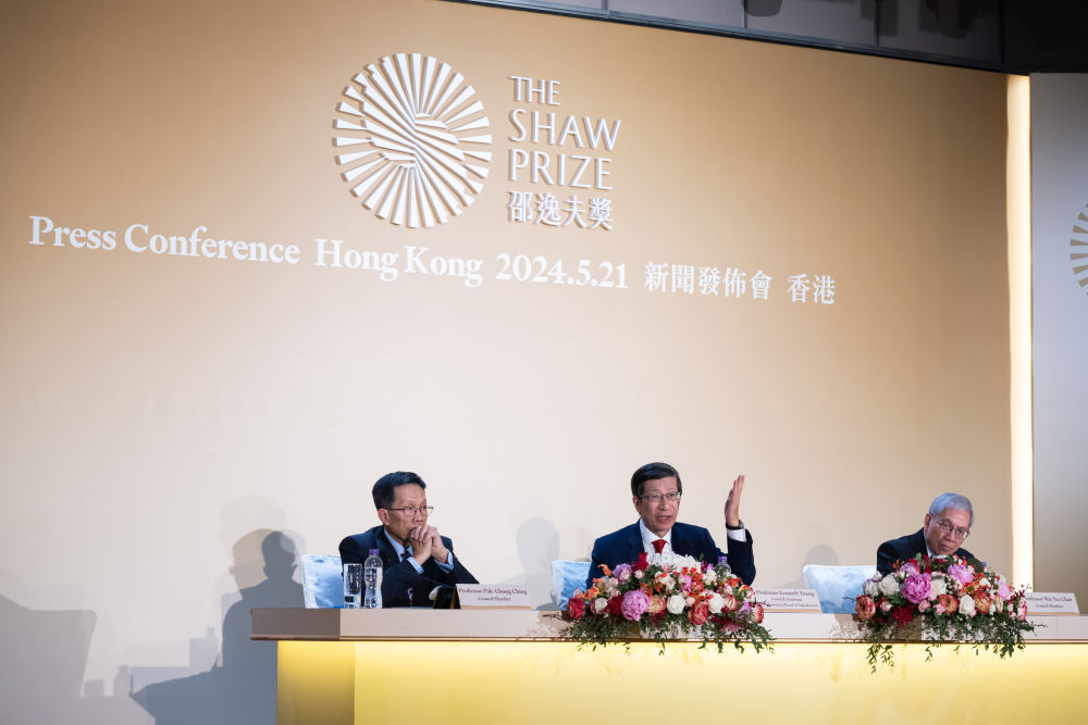 5月21日,邵逸夫獎理事會主席、評審會副主席楊綱凱(中)在2024年度邵逸夫獎新聞發(fā)布會現(xiàn)場發(fā)言。新華社記者 朱煒 攝