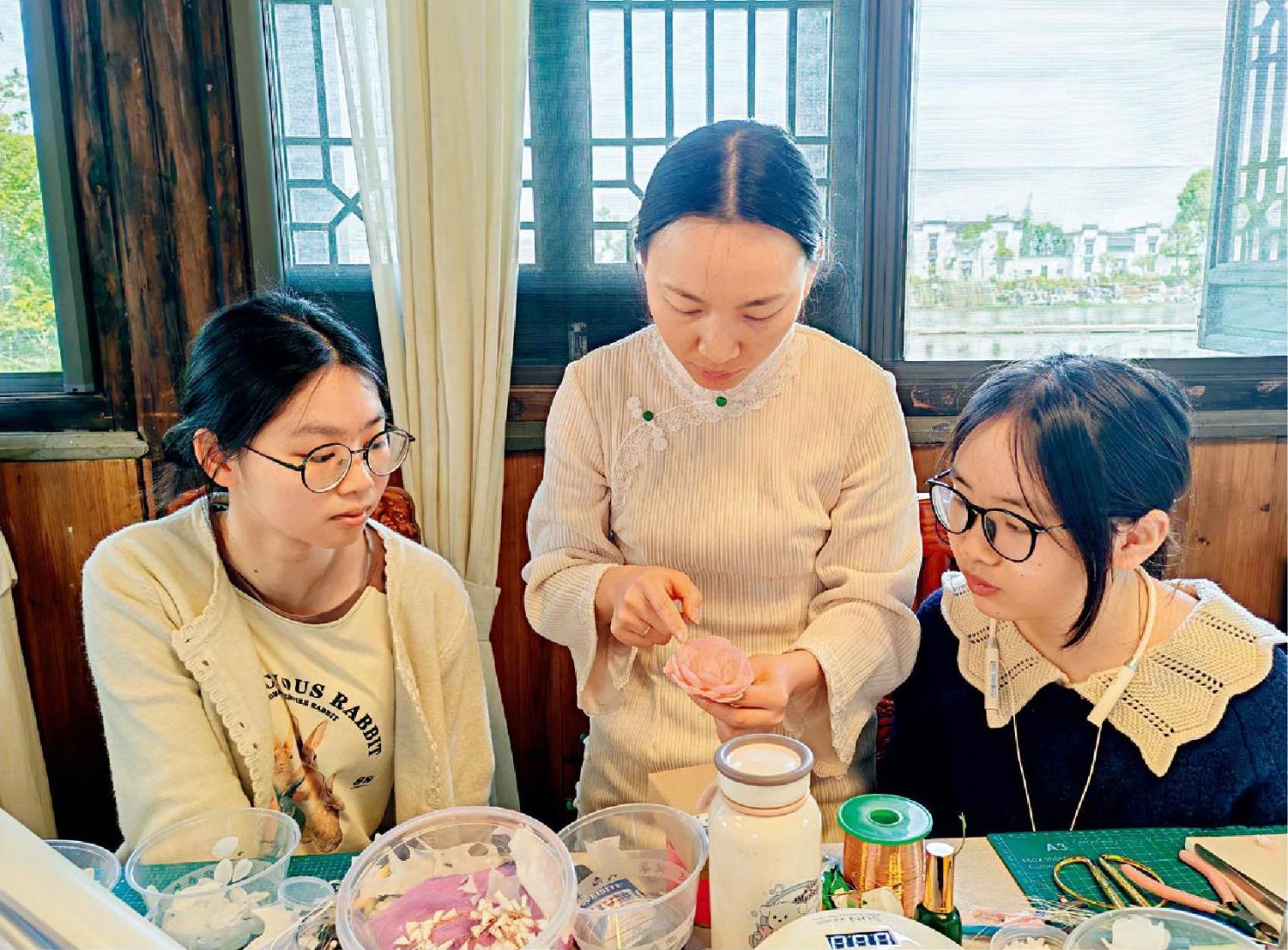 朱欣(中)教徒弟制作通草花。