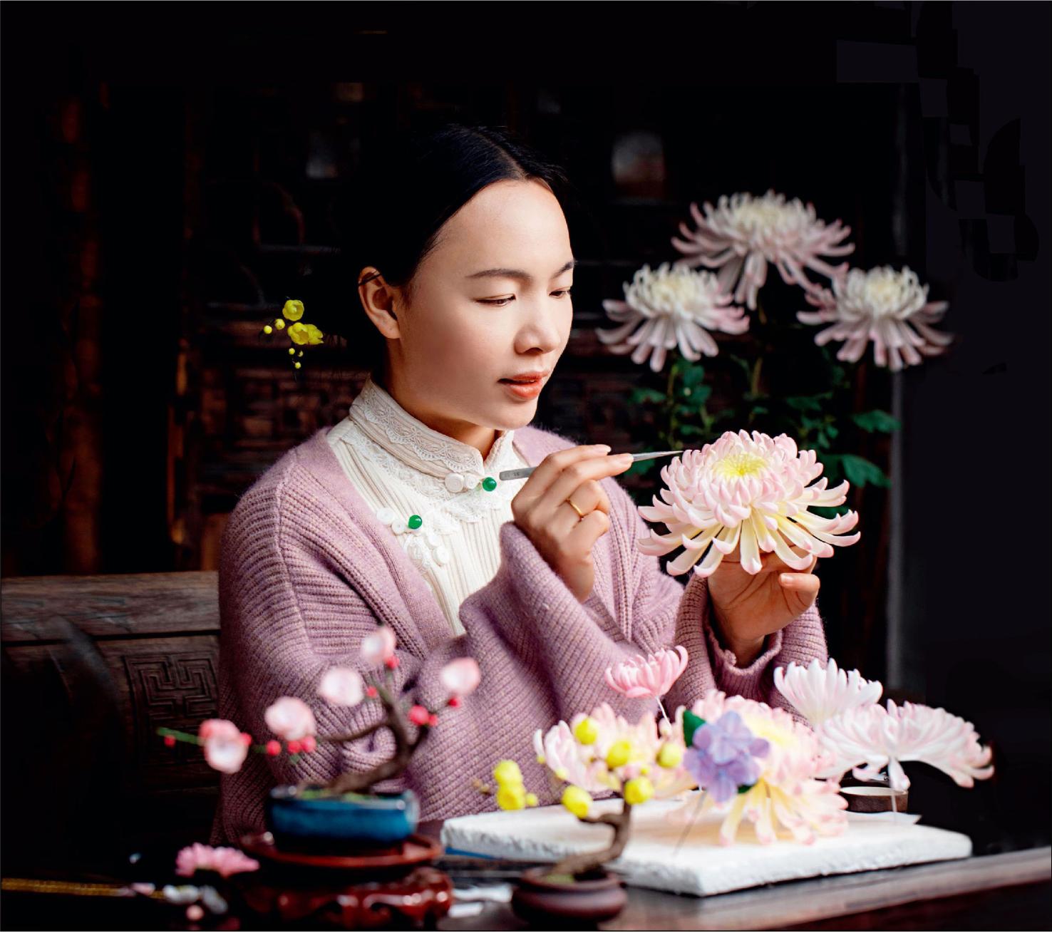 但她從不覺得苦。她用了一個外人聽來很夸張的說法:“自從做了通草花,我幾乎就沒有煩惱了。”她從不會覺得自己做花太耗時間,每天工作十幾個小時依然很開心。她覺得,沉浸式做花的時候不會受任何人的影響,只需待在這一平方米內專注于手上的花就行,過去幾年浮躁的心,終于“靜”下來了。