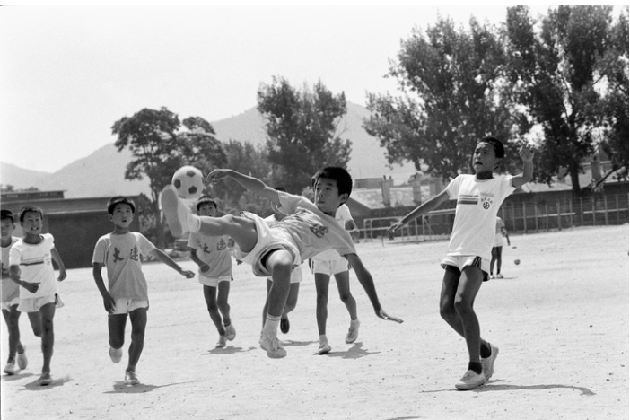 大連市東北路小學足球隊的隊員在練習比賽中:倒勾解危,化險為夷。(1984年10月8日發) 新華社記者程至善攝