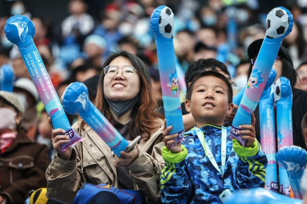 5月18日,球迷在場邊觀賽。當日,2024年國際中體聯足球世界杯揭幕戰在遼寧大連梭魚灣足球場舉行,中國中學生男子足球三隊7比2戰勝捷克中學生男子足球一隊。新華社記者 潘昱龍 攝