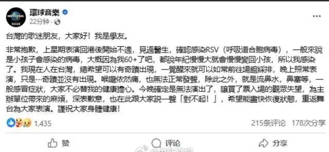 張學友也通過環球音樂官方社交賬號表示,自己感染了RSV(呼吸道合胞病毒),無法正常發聲,確定無法演出。