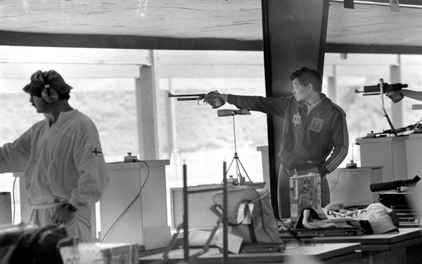 1984年7月29日,中國運動員許海峰(右)在洛杉磯奧運會男子自選手槍射擊比賽中。新華社記者 官天一 攝(傳真照片)