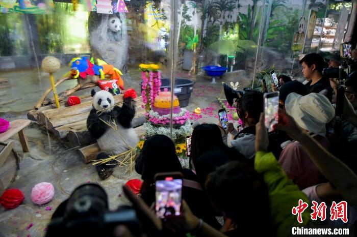 24日,海南熱帶野生動植物園(下稱“海野”)為熱帶大熊貓兄弟貢貢、舜舜舉行十一周歲生日慶典,民眾共同送上祝福,現(xiàn)場熱鬧非凡。