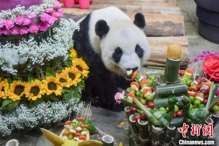 8月24日,大熊貓“貢貢”在海南熱帶野生動植物園享用生日大餐。中新網(wǎng)記者 駱云飛 攝