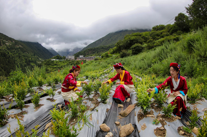 2022年,安徽省援藏工作隊在勒布溝引入莓茶種植,試驗性種植30畝,已開始采摘和制作,預計年帶動就業200人以上。這是當地村民在采摘莓茶(2023年7月28日攝)。新華社記者 旦增尼瑪曲珠 攝