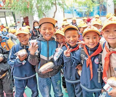 在西藏那曲市班戈縣中石化小學,學生手拿營養餐等待放學。新華社記者 丁增尼達攝