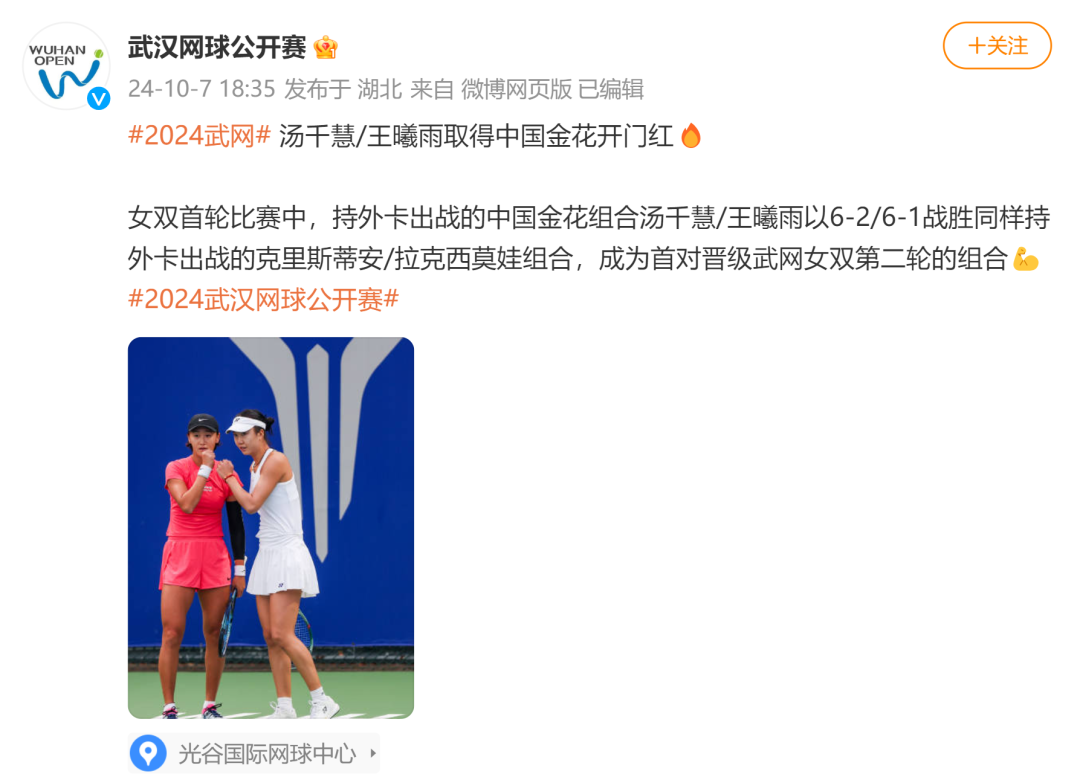 持外卡出戰的湯千慧/王曦雨以6-2/6-1戰勝同樣持外卡出戰的克里斯蒂安/拉克西莫娃組合,成為首對晉級武網女雙第二輪的組合。