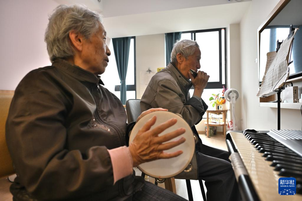 10月9日,在愛恩康養服務中心,劉爺爺和周奶奶一起演奏樂曲。