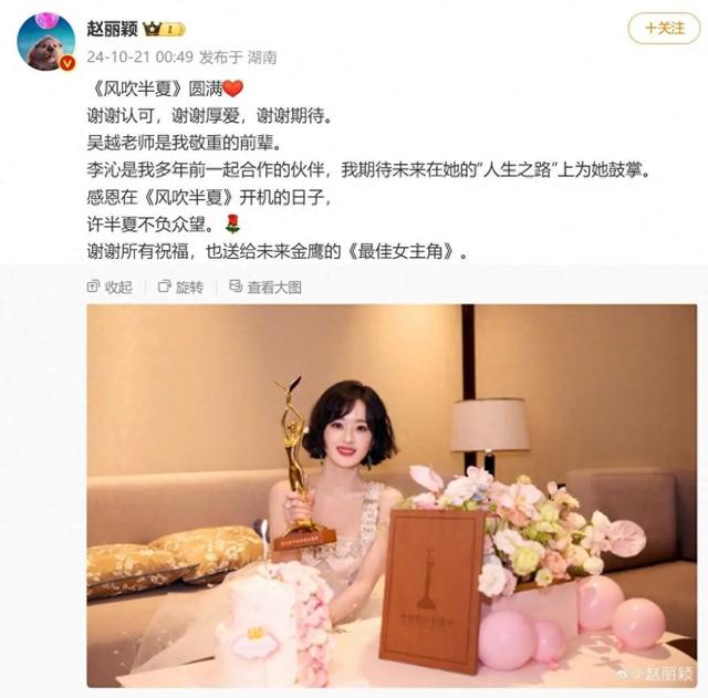 獲獎后,趙麗穎深夜發文:《風吹半夏》圓滿,謝謝認可,謝謝厚愛,謝謝期待。吳越老師是我敬重的前輩。李沁是我多年前一起合作的伙伴,我期待未來在她的“人生之路”上為她鼓掌。感恩在《風吹半夏》開機的日子,許半夏不負眾望。謝謝所有祝福,也送給未來金鷹的《最佳女主角》。