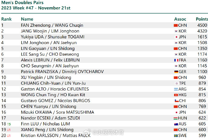 男雙方面,前十名排相較上周沒有變化,樊振東/王楚欽穩居世界第一,韓國組合張禹珍/林鐘勛排名第二,日本組合戶上隼輔/宇田幸矢排名第三。