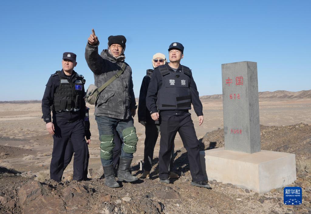 牧民朝勒門格爾勒(左二)和兒子溫都蘇(右二)與阿拉善左旗邊境管理大隊的民警在邊境地區巡護(11月17日攝)。新華社記者 王毓國 攝