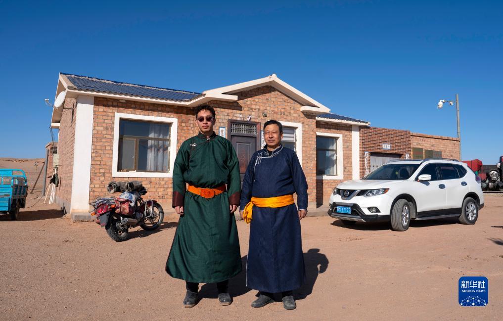 牧民朝勒門格爾勒(右)和兒子溫都蘇在家門口合影(11月17日攝)。新華社記者 才揚 攝
