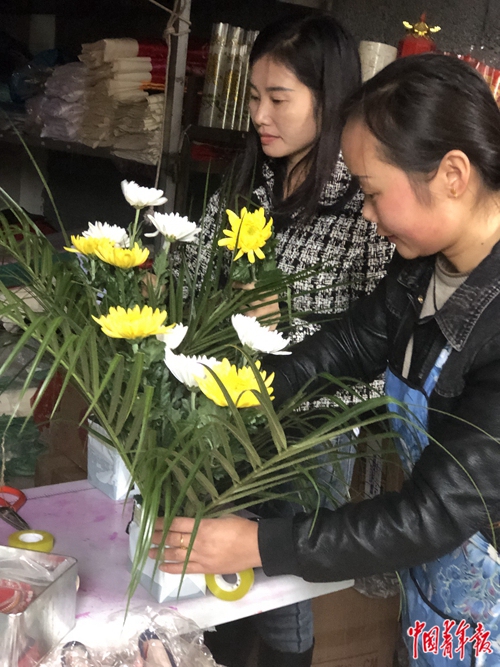 楊妞花給爸爸媽媽各買了一束菊花,準備去拜祭。