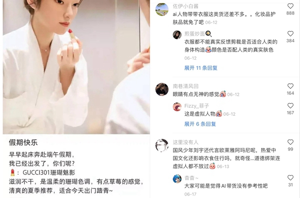 比如在代言這件事上,虛擬偶像就被吐槽了。有網友認為,虛擬偶像代言服飾尚可接受,但在代言食品或化妝品時,則難以給消費者真實的反饋。例如,虛擬偶像翎Ling在社交平臺發布口紅推廣時配文“滋潤不干”,便被用戶吐槽“完全沒有說服力”。