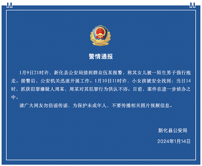 ·網傳湖南一女童在樓道被男子強行抱走?警方通報:犯罪嫌疑人已被抓獲。